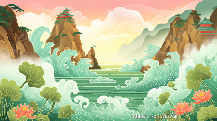 当前位置:首页>AI图库>风景图片>山峰山脉>山脉中翻卷的海水和荷花荷叶风景国风插画山脉中翻卷的海水和荷花荷叶风景国风插画