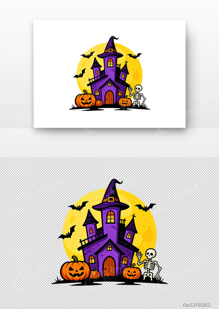 当前位置:素材网站>免抠元素>节日元素>紫色古堡南瓜灯与骷髅的万圣节插画
