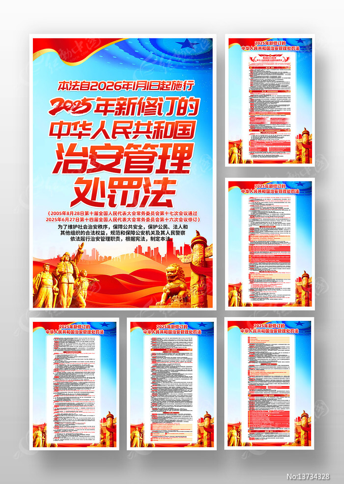红动中国提供原创2025年新修订的治安管理处罚法党建挂画下载,作品以治安管理处罚法为主题而设计,可作为治安管理处罚法,中华人民共和国,社会秩序社会,治理新修订,党建挂画等主题图片使用,2025年新修订的治安管理处罚法党建挂画,编号13734328,格式PSD,尺寸300x450毫米,大小48.76 MB,欢迎会员进行下载。