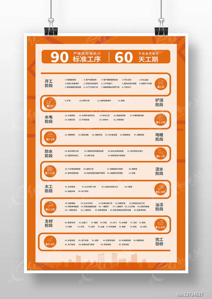 红动中国提供原创家装工期流程展板下载,作品以家装工期为主题而设计,可作为家装工期流程,家装工期展板,家装公司展板,家装节点展板,装修服务流程等主题图片使用,家装工期流程展板,编号13734637,格式AI,尺寸300x450毫米,大小1.75 MB,欢迎会员进行下载。