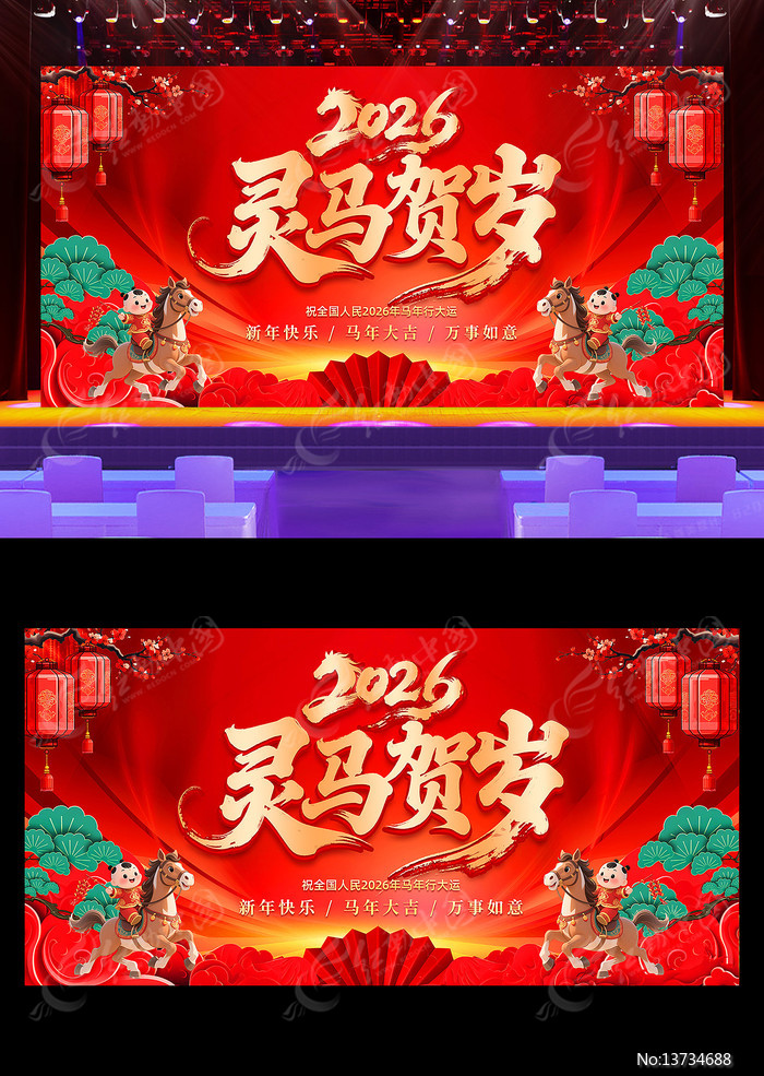 红动中国提供原创灵马贺岁2026年马年春节舞台背景展板下载,作品以马年为主题而设计,可作为元旦年会背景,跨年晚会,马年背景,马年大吉,马年晚会等主题图片使用,灵马贺岁2026年马年春节舞台背景展板,编号13734688,格式PSD,尺寸500x250毫米,大小174.68 MB,欢迎会员进行下载。