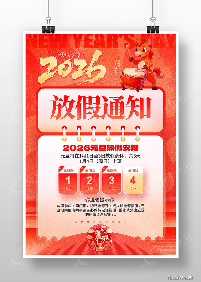 红动中国提供原创2026年元旦放假通知海报下载,作品以为主题而设计,可作为2026年放假通知,2026放假安排,春节放假通知,放假通知告示,放假通知公告等主题图片使用,2026年元旦放假通知海报,编号13734829,格式PSD,尺寸300x450毫米,大小92.1 MB,欢迎会员进行下载。