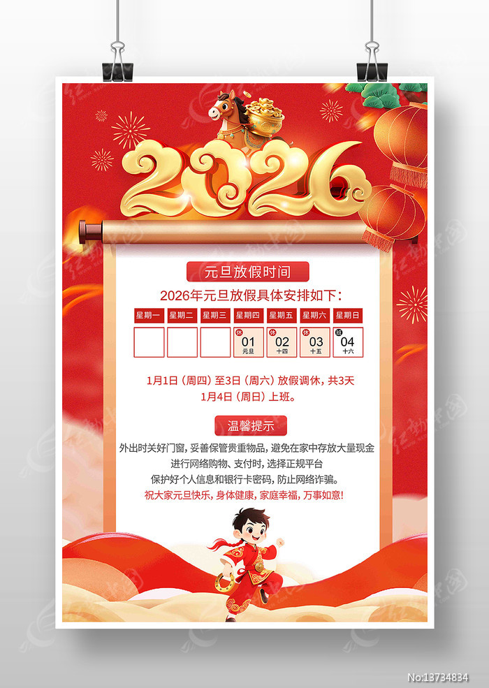 红动中国提供原创迎元旦2026年元旦放假通知海报下载,作品以为主题而设计,可作为2026年放假通知,2026放假安排,春节放假通知,放假通知告示,放假通知公告等主题图片使用,迎元旦2026年元旦放假通知海报,编号13734834,格式PSD,尺寸300x450毫米,大小85.13 MB,欢迎会员进行下载。