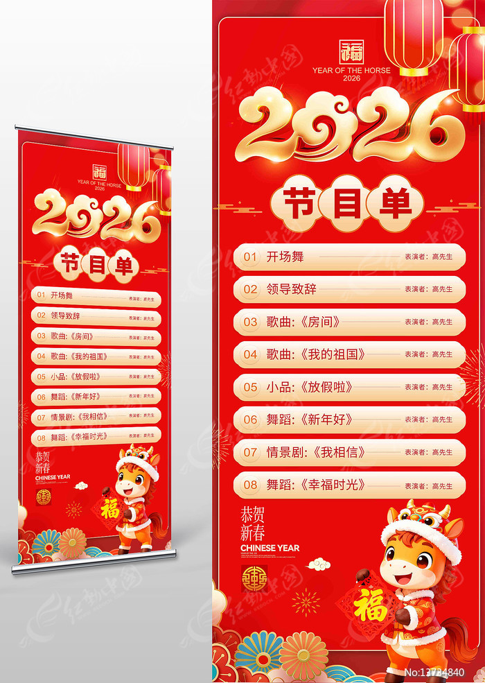 红动中国提供原创2026年马年春节晚会节目单展架下载,作品以年会为主题而设计,可作为节目单流程表,春节节目单,节目单安排,节目单海报,节目单模板等主题图片使用,2026年马年春节晚会节目单展架,编号13734840,格式PSD,尺寸800x2000毫米,大小17.57 MB,欢迎会员进行下载。
