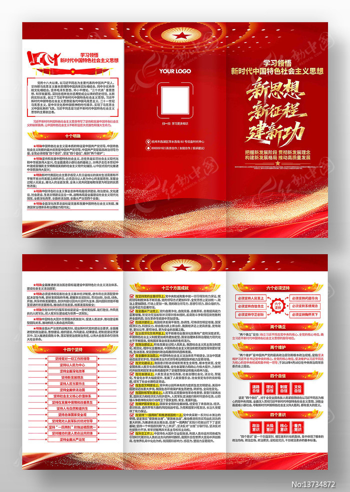 红动中国提供原创学习新时代中国特色社会主义思想宣传折页下载,作品以学习强军思想为主题而设计,可作为新时代中国特色社会主义思想,十三个方面成就,党员学习园地,六个必须坚持,思想体系纲要等主题图片使用,学习新时代中国特色社会主义思想宣传折页,编号13734872,格式PSD,尺寸297x210毫米,大小38.05 MB,欢迎会员进行下载。