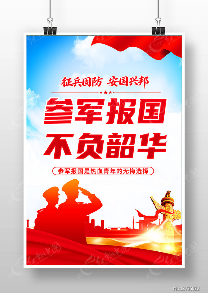 红动中国提供原创参军报国不负韶华部队征兵参军宣传海报下载,作品以参军宣传为主题而设计,可作为参军宣传标语,参军宣传挂图,参军宣传海报,军营文化标语,入伍参军海报等主题图片使用,参军报国不负韶华部队征兵参军宣传海报,编号13735032,格式PSD,尺寸300x450毫米,大小43.4 MB,欢迎会员进行下载。