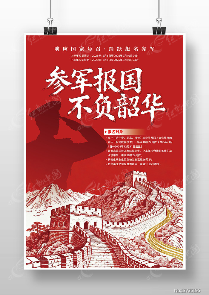 红动中国提供原创红色风格参军报国不负韶华参军征兵宣传海报下载,作品以入伍宣传为主题而设计,可作为部队宣传海报,军队征兵海报,入伍宣传海报,征兵宣传海报,保家卫国等主题图片使用,红色风格参军报国不负韶华参军征兵宣传海报,编号13735195,格式PSD,尺寸450x300毫米,大小63.05 MB,欢迎会员进行下载。