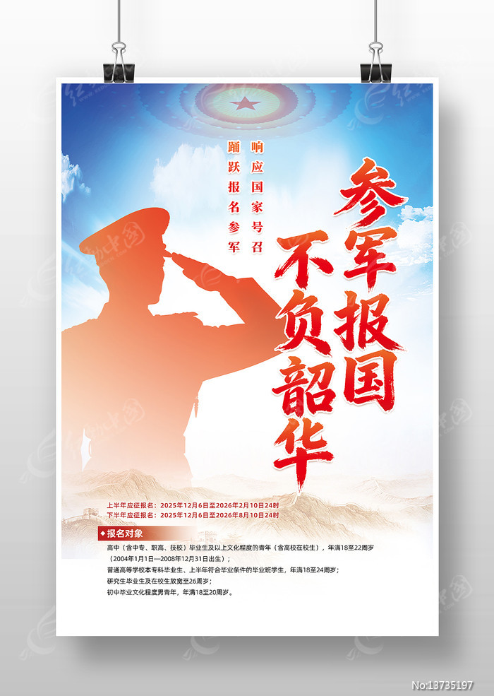 当前位置:设计网站>平面广告>展板>党建展板>参军报国不负韶华参军征兵宣传海报设计参军报国不负韶华参军征兵宣传海报设计