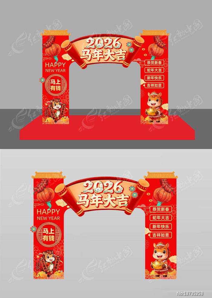 红动中国提供原创马年大吉2026年春节新年美陈拱门下载,作品以马年为主题而设计,可作为2026开门红 ,马年开门红,2026马年,2026年会,2026新年等主题图片使用,马年大吉2026年春节新年美陈拱门,编号13735253,格式PSD,尺寸2500x1000毫米,大小90.27 MB,欢迎会员进行下载。