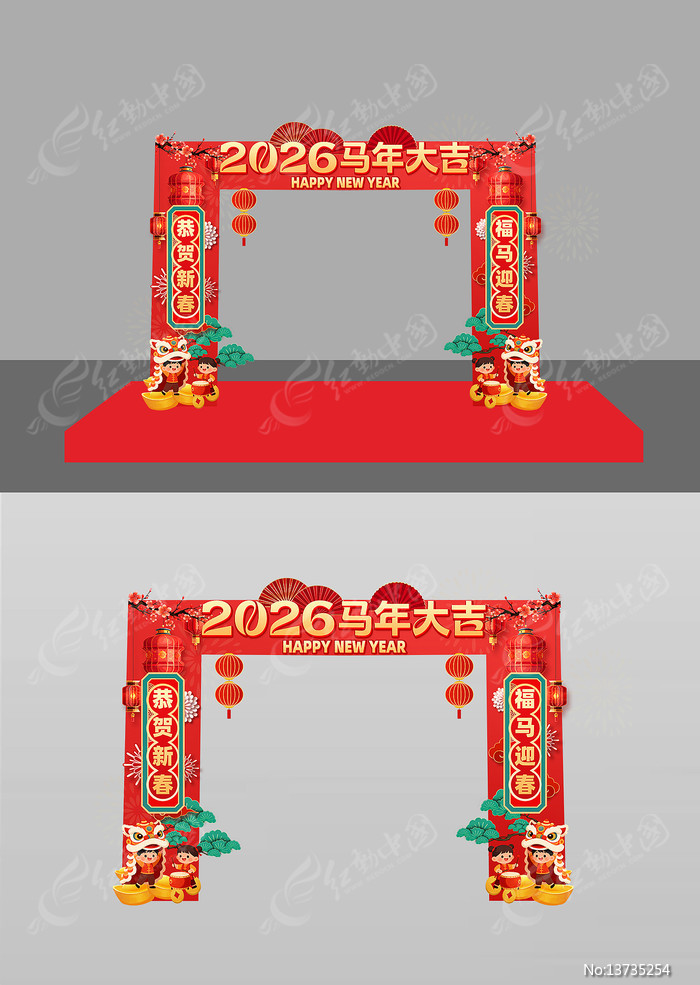 红动中国提供原创2026马年大吉新年春节拱门美陈下载,作品以马年为主题而设计,可作为2026开门红 ,马年开门红,2026马年,2026年会,2026新年等主题图片使用,2026马年大吉新年春节拱门美陈,编号13735254,格式PSD,尺寸2500x1000毫米,大小67.5 MB,欢迎会员进行下载。