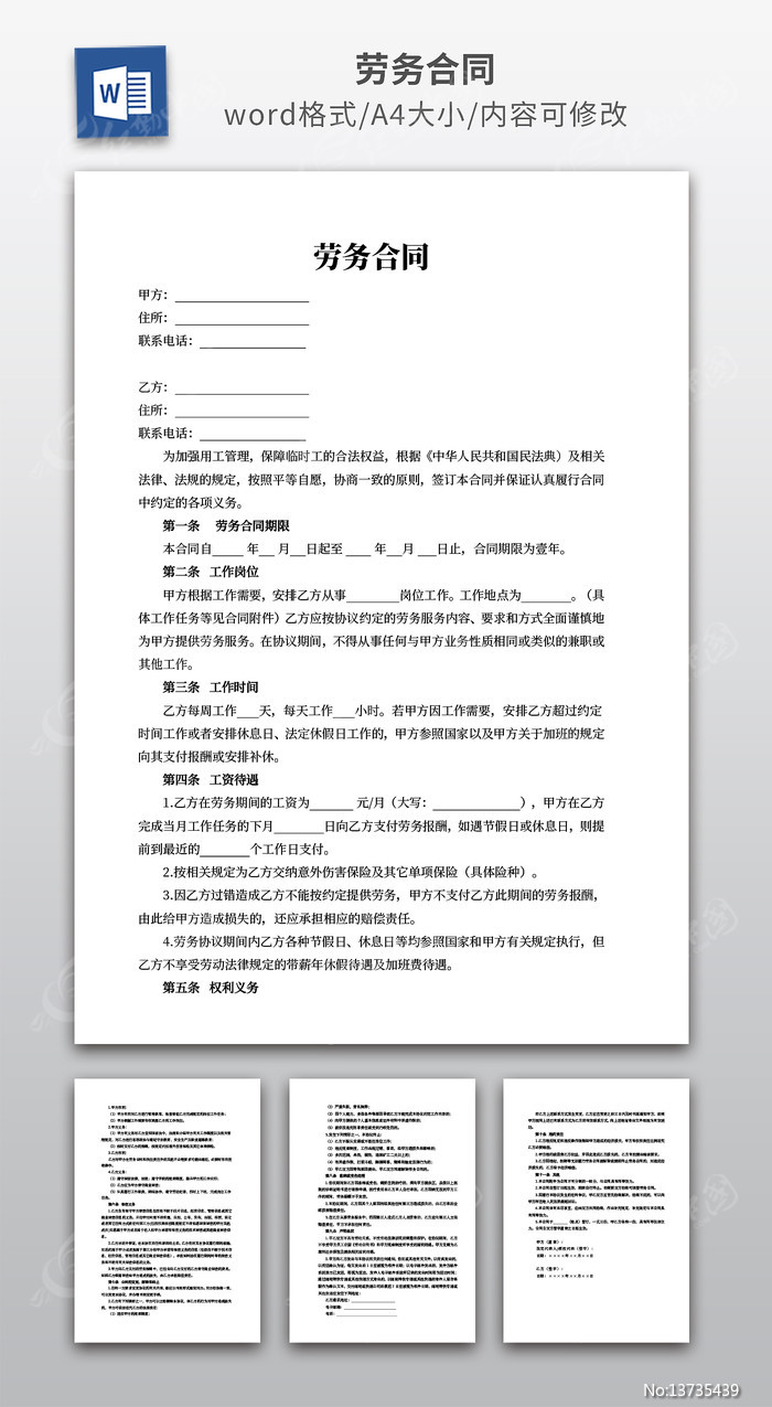 红动中国提供原创劳务合同下载,该作品还可作为劳动合同等范文模板使用,劳务合同编号13735439,大小,欢迎会员进行下载。