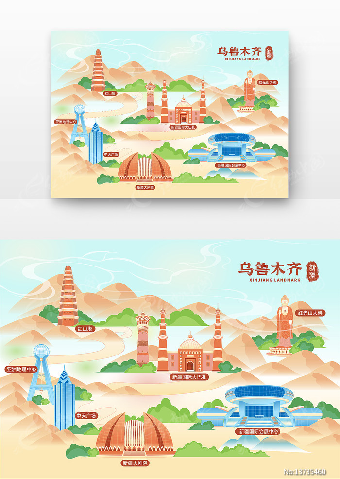 红动中国提供原创原创新疆乌鲁木齐城市地标彩色风景矢量插画下载,作品以乌鲁木齐为主题而设计,可作为新疆国际会展中心,新疆国际大巴扎,中亚地理中心,红光山大佛,新疆大剧院等主题插画图片使用,原创新疆乌鲁木齐城市地标彩色风景矢量插画编号13735460,格式EPS,大小6.15 MB,欢迎会员进行下载。