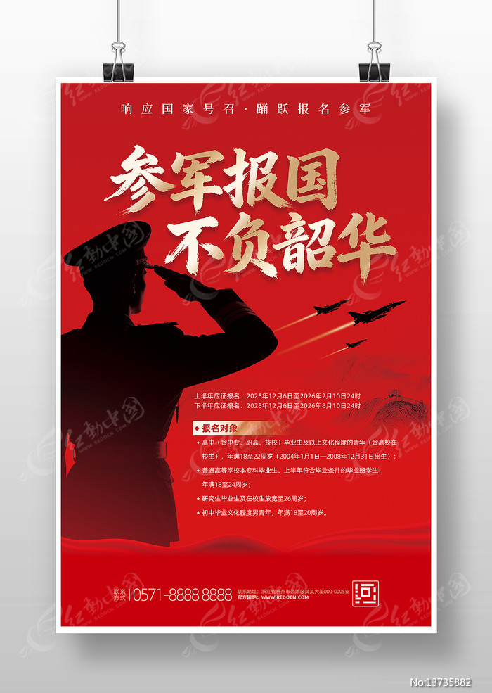 红动中国提供原创红色参军报国不负韶华部队参军征兵宣传海报下载,作品以征兵宣传为主题而设计,可作为部队宣传海报,部队宣传文化,军队征兵海报,入伍宣传海报,征兵宣传海报等主题图片使用,红色参军报国不负韶华部队参军征兵宣传海报,编号13735882,格式PSD,尺寸450x300毫米,大小99.5 MB,欢迎会员进行下载。