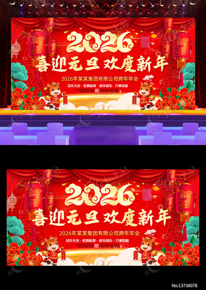 红动中国提供原创喜庆2026年迎元旦新年晚会舞台背景下载,作品以年会为主题而设计,可作为年会盛典舞台,年会舞台背景,年会颁奖礼,年会签到处,年会主视觉等主题图片使用,喜庆2026年迎元旦新年晚会舞台背景,编号13736078,格式PSD,尺寸600x300毫米,大小90.57 MB,欢迎会员进行下载。