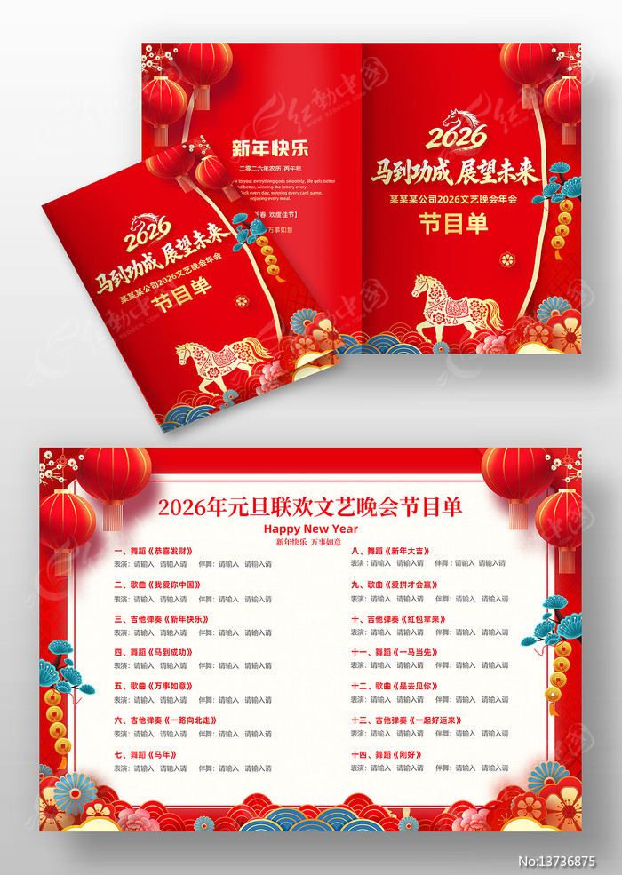 红动中国提供原创2026年马年春节企业年会晚会节目单模板下载,作品以2026年为主题而设计,可作为2026年节目单,文艺汇演节目,文艺晚会节目,元旦文艺汇演,春节节目单等主题图片使用,2026年马年春节企业年会晚会节目单模板,编号13736875,格式PSD,尺寸300x210毫米,大小48.68 MB,欢迎会员进行下载。