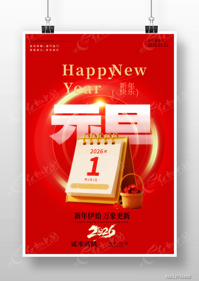 红动中国提供原创2026年元旦跨年海报下载,作品以元旦为主题而设计,可作为元旦海报,2026,跨年,马年,新年等主题图片使用,2026年元旦跨年海报,编号13736888,格式PSD,尺寸450x300毫米,大小48.41 MB,欢迎会员进行下载。