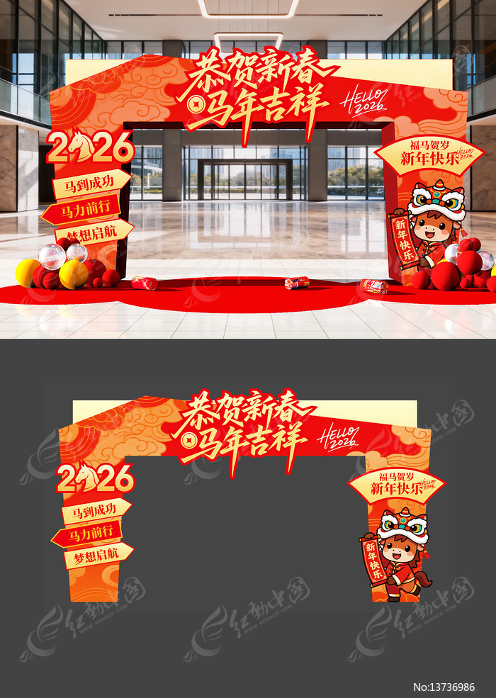 红动中国提供原创原创春节新年拱门美陈下载,作品以春节为主题而设计,可作为春节拱门,春节美陈,马年拱门,年会拱门,年货大街等主题图片使用,原创春节新年拱门美陈,编号13736986,格式AI,尺寸500x200毫米,大小82.18 MB,欢迎会员进行下载。