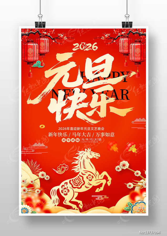 红动中国提供原创2026马年新春新年元旦快乐海报下载,作品以2026元旦为主题而设计,可作为马年元旦海报,2026新春,2026元旦,欢度元旦,龙年大吉等主题图片使用,2026马年新春新年元旦快乐海报,编号13737094,格式PSD,尺寸300x450毫米,大小30.95 MB,欢迎会员进行下载。