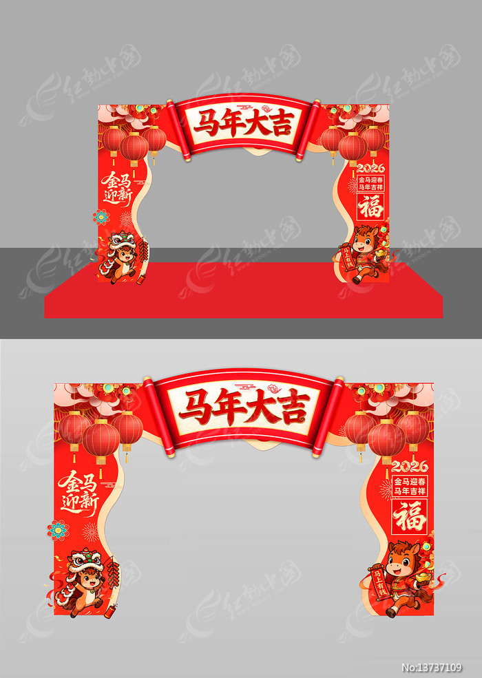 红动中国提供原创2026马年大吉拱门美陈下载,作品以马年开门红为主题而设计,可作为2026开门红,马年开门红,2026马年,2026年会,2026新年等主题图片使用,2026马年大吉拱门美陈,编号13737109,格式PSD,尺寸3000x1000毫米,大小66.53 MB,欢迎会员进行下载。