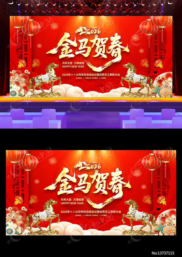 红动中国提供原创金马贺春2026马年新年春节舞台背景展板下载,作品以新年快乐为主题而设计,可作为跨年晚会,马年背景,马年大吉,马年晚会,马年舞台等主题图片使用,金马贺春2026马年新年春节舞台背景展板,编号13737115,格式PSD,尺寸600x300毫米,大小124.35 MB,欢迎会员进行下载。