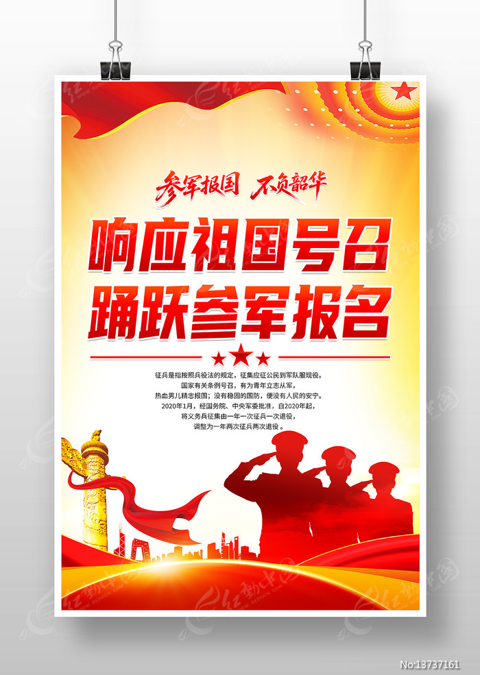 红动中国提供原创响应祖国号召踊跃参军报名部队征兵宣传海报下载,作品以参军宣传为主题而设计,可作为参军宣传标语,参军宣传挂图,参军宣传海报,军营文化标语,入伍参军海报等主题图片使用,响应祖国号召踊跃参军报名部队征兵宣传海报,编号13737161,格式PSD,尺寸400x600毫米,大小74.67 MB,欢迎会员进行下载。