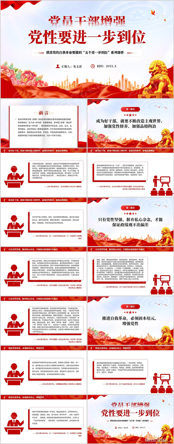 红动中国提供原创党员干部增强党性要进一步到位PPT下载,作品以五个进一步到位为主题而设计,可作为五个进一步到位,固本培元,自我革命,政绩观,党性等主题PPT使用,党员干部增强党性要进一步到位PPT编号13737163,格式pptx,大小5.1 MB,欢迎会员进行下载。
