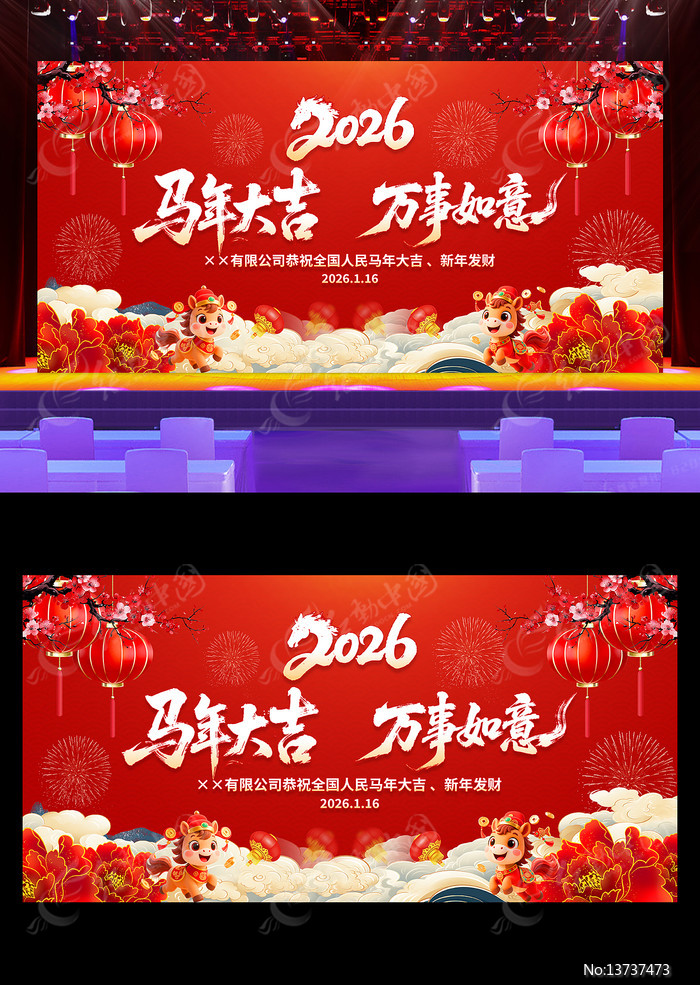 红动中国提供原创马年大吉2026年会马年春节晚会舞台背景下载,作品以年会背景为主题而设计,可作为跨年晚会,马年背景,马年大吉,马年海报,马年晚会等主题图片使用,马年大吉2026年会马年春节晚会舞台背景,编号13737473,格式PSD,尺寸600x300毫米,大小118.06 MB,欢迎会员进行下载。