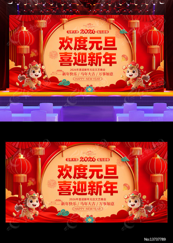 红动中国提供原创欢度元旦喜迎新2026元旦晚会舞台展板下载,作品以马年背景为主题而设计,可作为舞台背景企,跨年晚会,马年背景,马年大吉,马年海报等主题图片使用,欢度元旦喜迎新2026元旦晚会舞台展板,编号13737789,格式PSD,尺寸500x250毫米,大小41.23 MB,欢迎会员进行下载。
