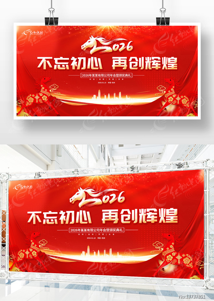红动中国提供原创不忘初心再创辉煌2026企业年会背景展板下载,作品以年会为主题而设计,可作为年会舞台背景,企业年会背景,颁奖典礼,表彰大会,会议背景等主题图片使用,不忘初心再创辉煌2026企业年会背景展板,编号13737851,格式PSD,尺寸1200x600毫米,大小105.82 MB,欢迎会员进行下载。