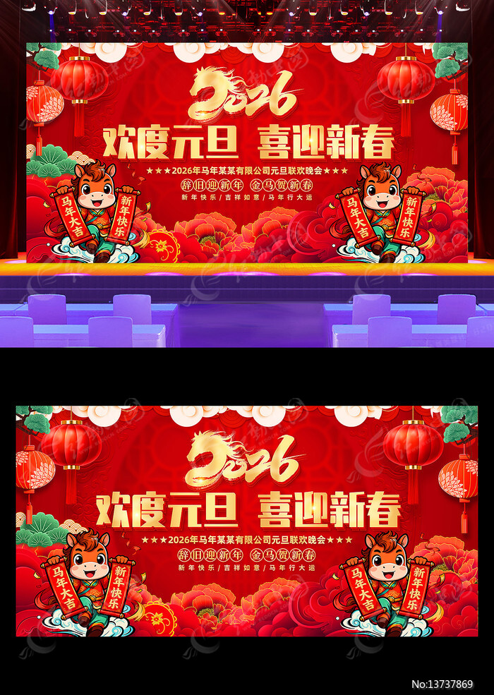 红动中国提供原创2026马年元旦联欢晚会新年春节舞台背景下载,作品以元旦年会背景为主题而设计,可作为2026跨年晚会,元旦年会背景,马年背景,马年大吉,马年晚会等主题图片使用,2026马年元旦联欢晚会新年春节舞台背景,编号13737869,格式PSD,尺寸500x250毫米,大小94.92 MB,欢迎会员进行下载。