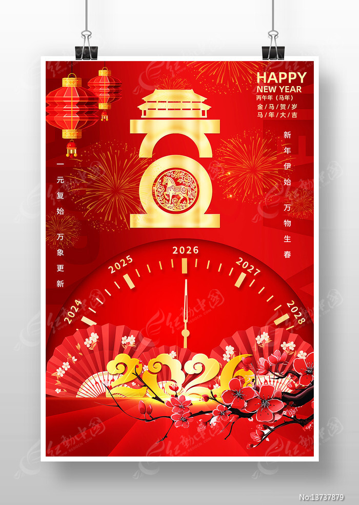 红动中国提供原创红色喜庆2026马年新年春节元旦海报下载,作品以元旦新年为主题而设计,可作为2026年马年元旦海报,元旦新年海报,2026新春,2026元旦,欢度元旦等主题图片使用,红色喜庆2026马年新年春节元旦海报,编号13737879,格式PSD,尺寸300x450毫米,大小58.77 MB,欢迎会员进行下载。