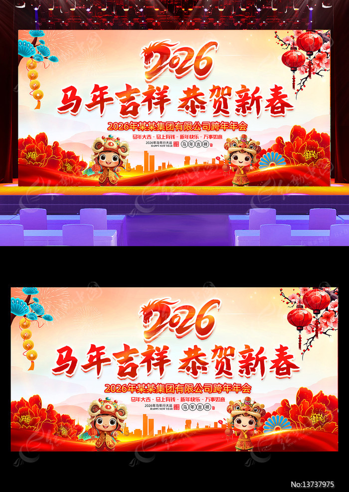 红动中国提供原创喜庆2026马年新年年会宣传展板背景下载,作品以年会盛典舞台为主题而设计,可作为年会盛典舞台,年会舞台背景,年会颁奖礼,年会签到处,年会主视觉等主题图片使用,喜庆2026马年新年年会宣传展板背景,编号13737975,格式PSD,尺寸600x300毫米,大小64.28 MB,欢迎会员进行下载。