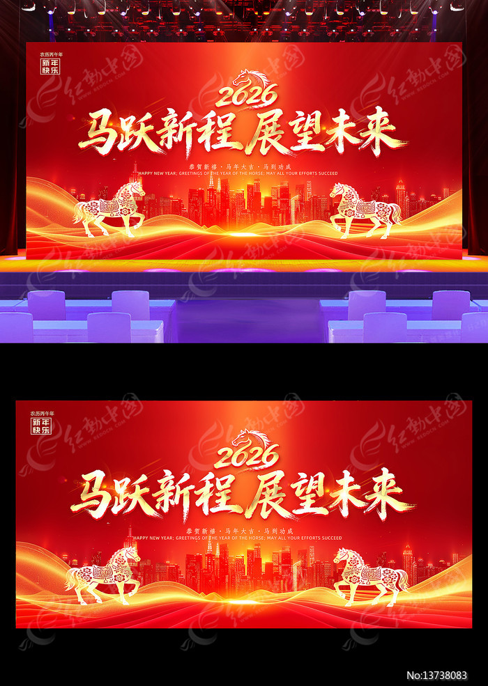 红动中国提供原创红色大气2026年企业年会晚会舞台背景下载,作品以2026元旦背景为主题而设计,可作为2026马年元旦,2026元旦背景,2026元旦晚会,马年元旦背景,马年元旦晚会等主题图片使用,红色大气2026年企业年会晚会舞台背景,编号13738083,格式PSD,尺寸600x300毫米,大小65.94 MB,欢迎会员进行下载。
