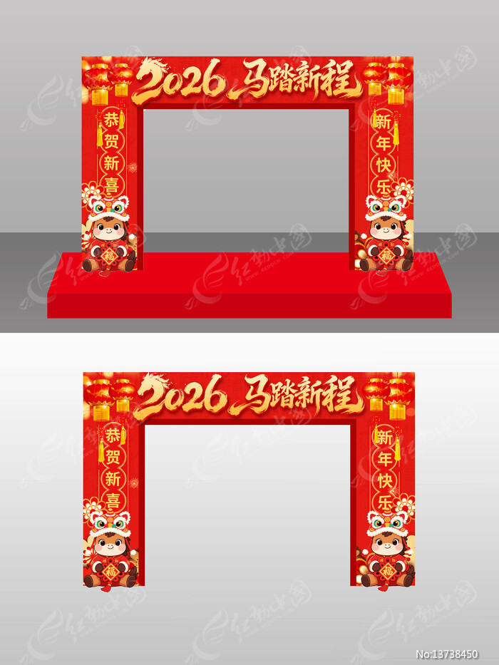 红动中国提供原创2026年马踏新程春节新年美陈拱门设计下载,作品以开门红为主题而设计,可作为2026开门红,2026照相框,开门红美陈,马年开门红,2026马年等主题图片使用,2026年马踏新程春节新年美陈拱门设计,编号13738450,格式PSD,尺寸300x450毫米,大小49.05 MB,欢迎会员进行下载。
