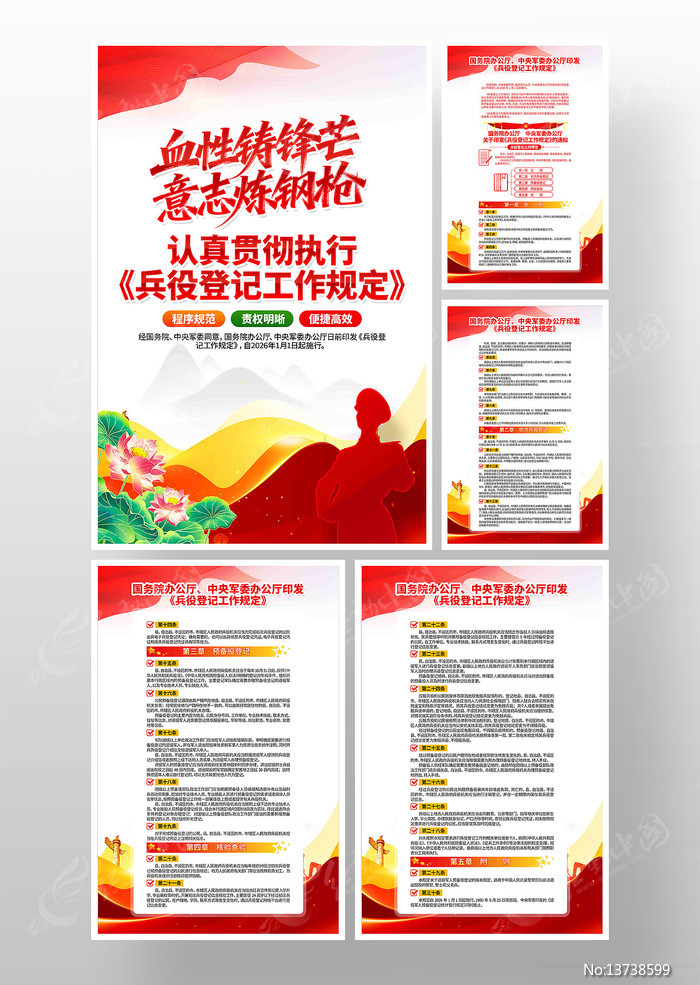 红动中国提供原创贯彻执行兵役登记工作规定党建挂画展板下载,作品以新时代兵役登记机制为主题而设计,可作为新时代兵役登记制度机制,兵役登记工作规定,兵役登记工作,解放军各单位,兵役登记等主题图片使用,贯彻执行兵役登记工作规定党建挂画展板,编号13738599,格式PSD,尺寸300x450毫米,大小46.68 MB,欢迎会员进行下载。