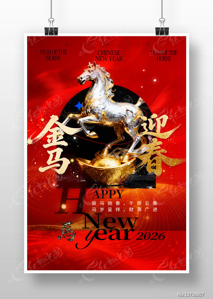 红动中国提供原创金马迎春新年海报下载,作品以马年为主题而设计,可作为马年海报,新年海报,2026,拜年,贺岁等主题图片使用,金马迎春新年海报,编号13738807,格式PSD,尺寸450x300毫米,大小85.94 MB,欢迎会员进行下载。