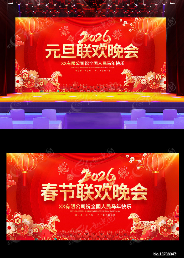 红动中国提供原创2026马年新年元旦春节晚会舞台背景展板下载,作品以元旦联欢晚会为主题而设计,可作为春节联欢晚会,元旦联欢晚会,表彰大会,红色背景,联欢晚会等主题图片使用,2026马年新年元旦春节晚会舞台背景展板,编号13738947,格式PSD,尺寸600x300毫米,大小138.68 MB,欢迎会员进行下载。