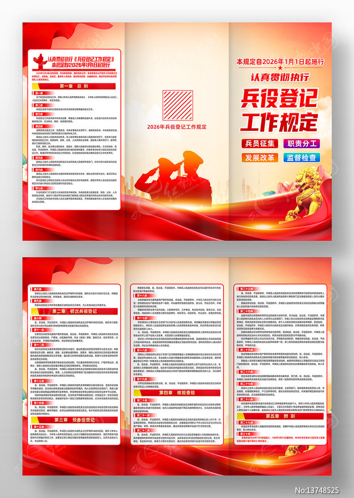 红动中国提供原创2026年兵役登记工作规定部队宣传折页下载,作品以兵役登记为主题而设计,可作为兵役登记工作,兵役登记宣传,兵役登记折页,初次兵役登记,全的兵役登记等主题图片使用,2026年兵役登记工作规定部队宣传折页,编号13748525,格式PSD,尺寸297x210毫米,大小29.28 MB,欢迎会员进行下载。
