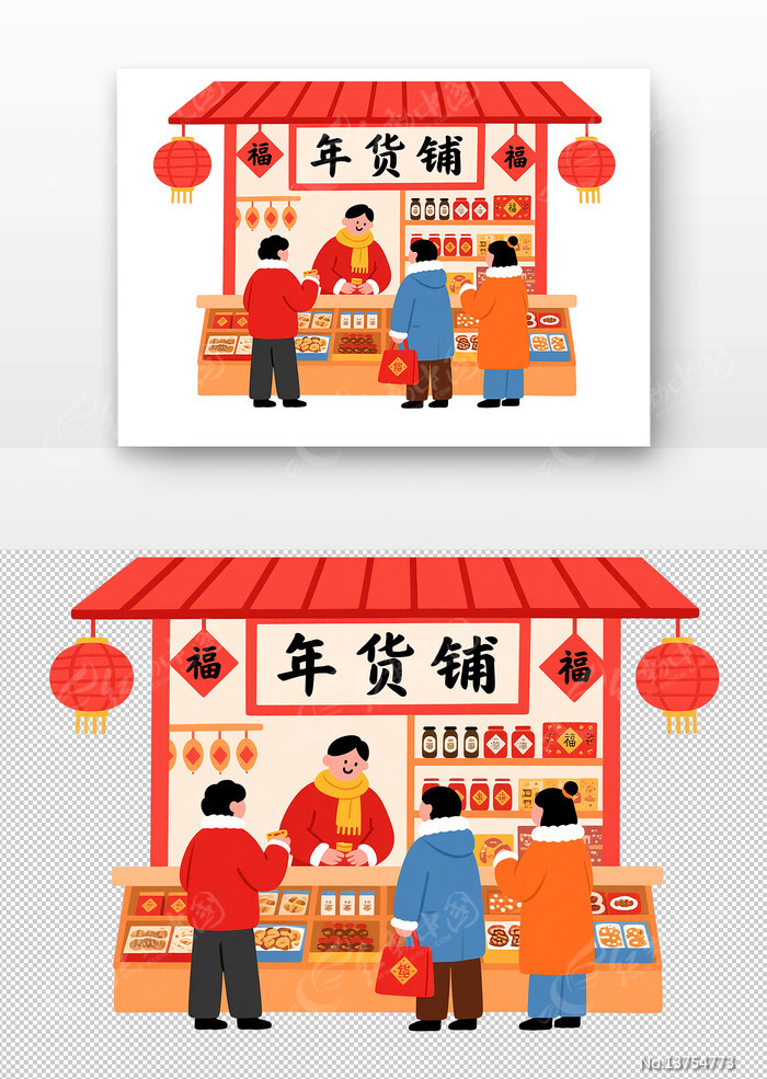 当前位置:素材网站>免抠元素>卡通手绘>春节年货节年货摊前顾客选购