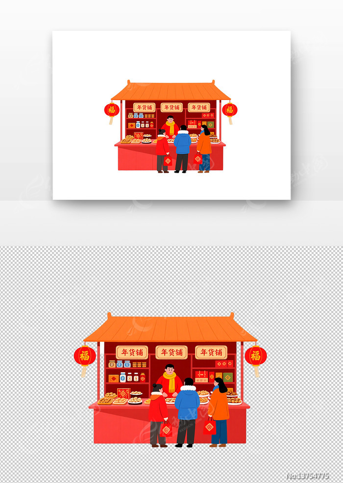 当前位置:素材网站>免抠元素>卡通手绘>年货铺前顾客选购年货的温馨场景