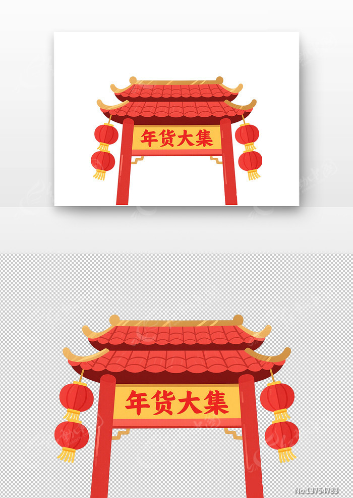 当前位置:素材网站>免抠元素>卡通手绘>年货大集牌坊拱门插画