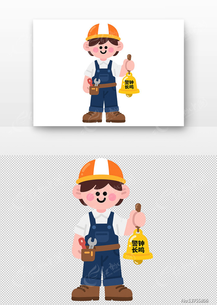 当前位置:素材网站>免抠元素>卡通手绘>戴安全帽敲警钟的卡通工人形象
