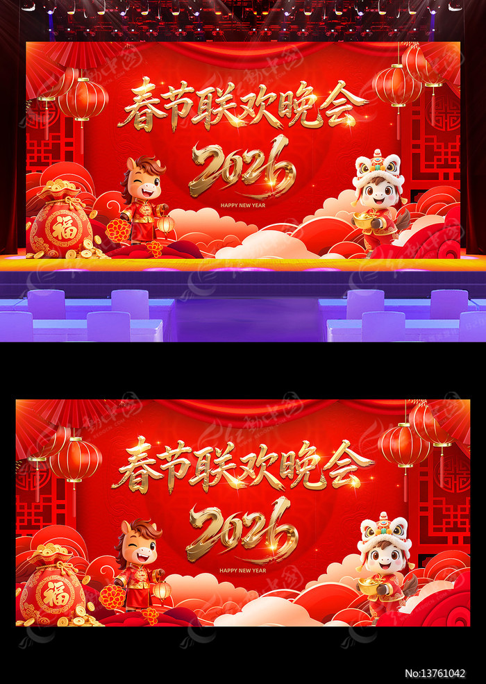 当前位置:设计网站>平面广告>展板>节日节气>2026喜庆马年春节联欢晚会舞台展板背景2026喜庆马年春节联欢晚会舞台展板背景