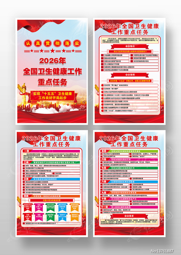 红动中国提供原创2026年全国卫生健康工作任务海报挂画下载,作品以全国卫生健康工作会议为主题而设计,可作为全国卫生健康工作会议,卫生健康工作,健康中国,重点工作,2026年等主题图片使用,2026年全国卫生健康工作任务海报挂画,编号13761887,格式PSD,尺寸600x400毫米,大小44.48 MB,欢迎会员进行下载。