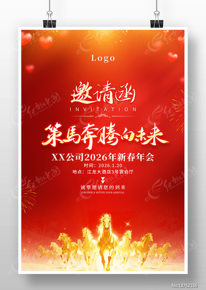 红动中国提供原创2026新春年会邀请函海报下载,作品以马年年会为主题而设计,可作为2026年会邀请函海报,2026年会邀请函,马年年会邀请函,年会邀请函海报,马年邀请函等主题图片使用,2026新春年会邀请函海报,编号13762156,格式PSD,尺寸600x900毫米,大小119.62 MB,欢迎会员进行下载。