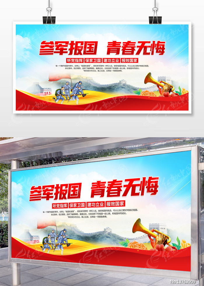 红动中国提供原创部队征兵宣传海报下载,作品以服兵役当兵为主题而设计,可作为服兵役当兵海报,参军入伍标语,保家卫国,部队海报,部队宣传等主题图片使用,部队征兵宣传海报,编号13762909,格式PSD,尺寸300x600毫米,大小131.51 MB,欢迎会员进行下载。