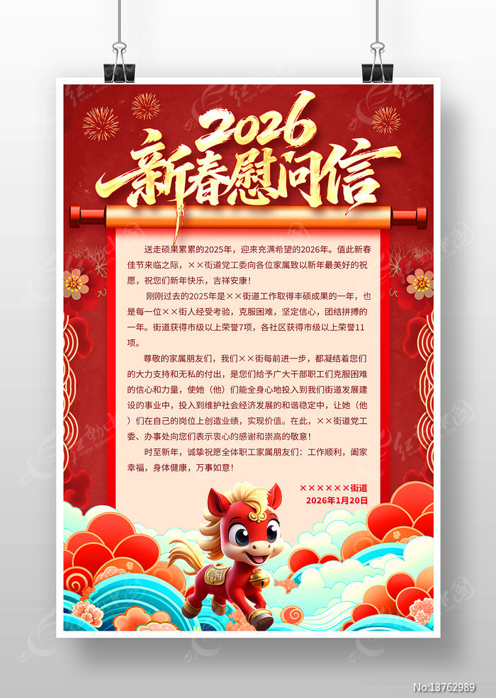 红动中国提供原创2026马年春节新春慰问信海报设计下载,作品以企业感谢信为主题而设计,可作为2026新年祝福,春节慰问信,企业感谢信,企业慰问信,春节海报等主题图片使用,2026马年春节新春慰问信海报设计,编号13762989,格式PSD,尺寸400x600毫米,大小129.35 MB,欢迎会员进行下载。