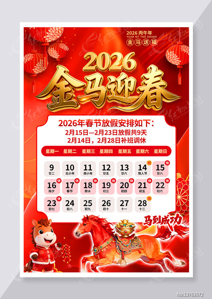 红动中国提供原创春节放假通知海报下载,作品以马年为主题而设计,可作为马年春节放假通知,春节放假通知,放假通知海报,放假通知展板,马年放假通知等主题图片使用,春节放假通知海报,编号13763572,格式PSD,尺寸600x400毫米,大小155.39 MB,欢迎会员进行下载。