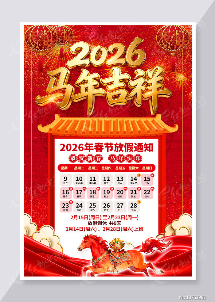 红动中国提供原创2026马年企业公司春节放假通知宣传海报下载,作品以春节为主题而设计,可作为马年春节放假通知,春节放假通知,放假通知海报,放假通知展板,马年放假通知等主题图片使用,2026马年企业公司春节放假通知宣传海报,编号13763983,格式PSD,尺寸600x400毫米,大小304.87 MB,欢迎会员进行下载。