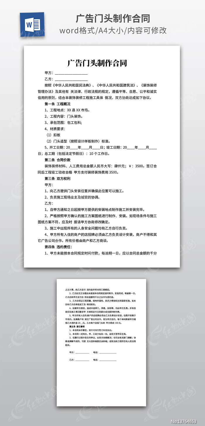 红动中国提供原创广告门头制作合同下载,该作品还可作为门头制作安装协议等范文模板使用,广告门头制作合同编号13764653,大小,欢迎会员进行下载。